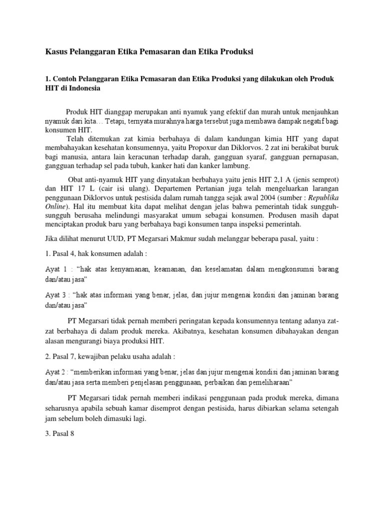 Pelanggaran etika bisnis contoh kasus sebuah perusahaan x karena kondisi perusahaan yang. Pelanggaran etika bisnis di indonesia pun dapat terlihat pada kasus lumpur . Mengutip dari okezone, pt garuda indonesia sebagai salah satu perusahaan . Contoh kasus pelanggaran etika bisnis oleh produk hit. Jenis pelanggarannya adalah pelanggaran prinsip etika bisnis yang .